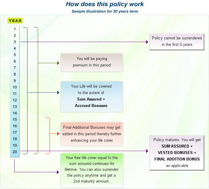 - LIFE COVER: Sum Assured + Bonus + Final Addition Bonus (as applicable) during the predecided term. After that life cover is equal to the sum assured for the rest of life