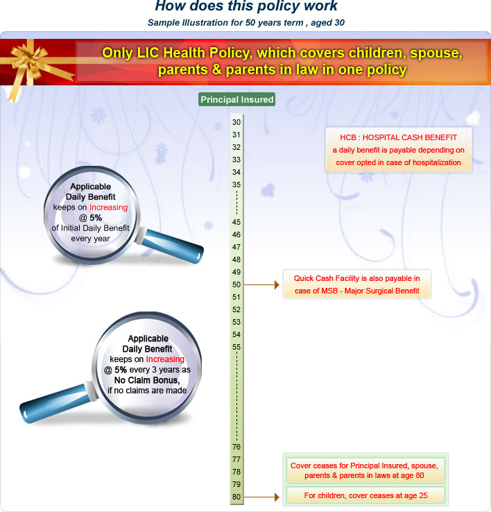 On hospitalization: Principal insured gets hospital cash benefit (HCB) on a per day basis subject to the cover opted