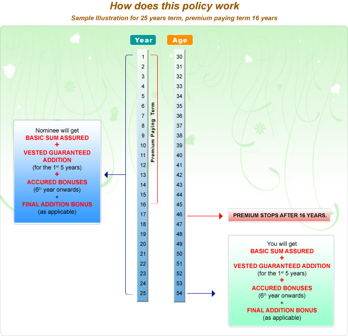 • Life Cover from 6th year onwards: Sum Assured +Guaranteed Additions for the 1st 5 years + accrued bonuses declared from 6th year onwards + Final Addition Bonus (as applicable)